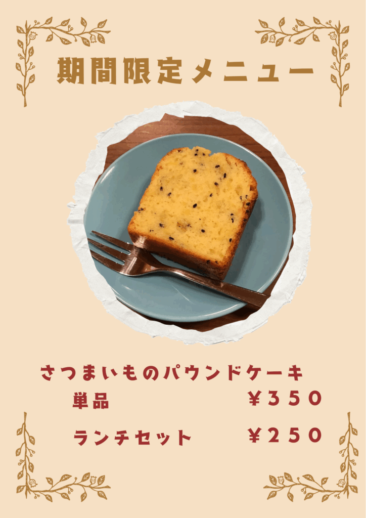 期間限定でさつまいものパウンドケーキ販売します。 2025 11/01 café POWOW 2025年11月1日 今月から期間限定でさつまいものパウンドケーキを販売します! パウンドケーキの外側がカリカリ、中がフワフワで さつまいもの自然な甘さが感じられます。 ぜひご賞味ください。 café POWOW よかったらシェアしてね! URLをコピーしました! URLをコピーしました! 花壇にお花を植えました この記事を書いた人 cafe_powow 関連記事 花壇にお花を植えました 2025年9月27日 季節限定しそジュース🍹 2025年9月4日 6月カフェ営業日のお知らせ 2025年5月27日 素敵なおしぼりアート🌷 2025年4月15日 4月営業日カレンダー 2025年3月24日 定休日変更のお知らせ 2025年3月14日 2024年10月29日 11月のカフェ営業日 2024年10月29日 コメント コメントする コメントをキャンセルコメント ※ 名前 ※ メール ※ サイト 次回のコメントで使用するためブラウザーに自分の名前、メールアドレス、サイトを保存する。